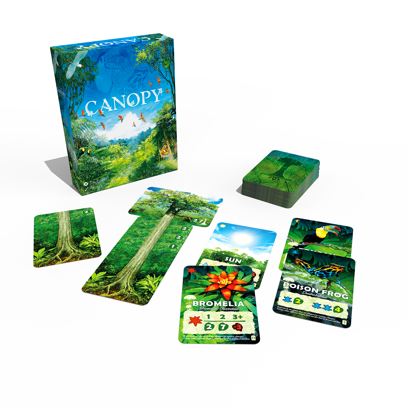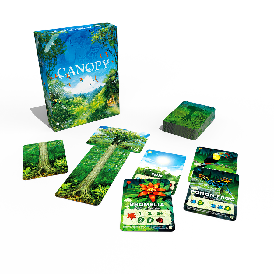 Canopy is a game for two (with solo and 3-4 player rules included), where players compete to grow the most bountiful rainforest. The jungle ecosystem is full of symbiosis, and players must grow tall trees and lush jungle plants to attract the most diverse wildlife. By carefully selecting what grows in your forest you can create the ideal balance of flora and fauna and give rise to a thriving ecosystem.