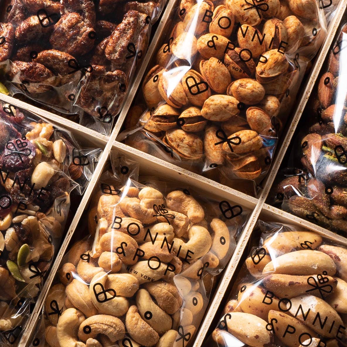 Salted Pistachios, Cranberry Health Mix, Honey Mustard Mix, Spicy Pub Mix, Butter Toffee Peanuts, Salted Mixed Nuts, Tamari Almonds, Hot N' Spicy Peanuts, Antioxidant Nut Mix, Corn Nuts, Monster Mix, Glazed Pecans.