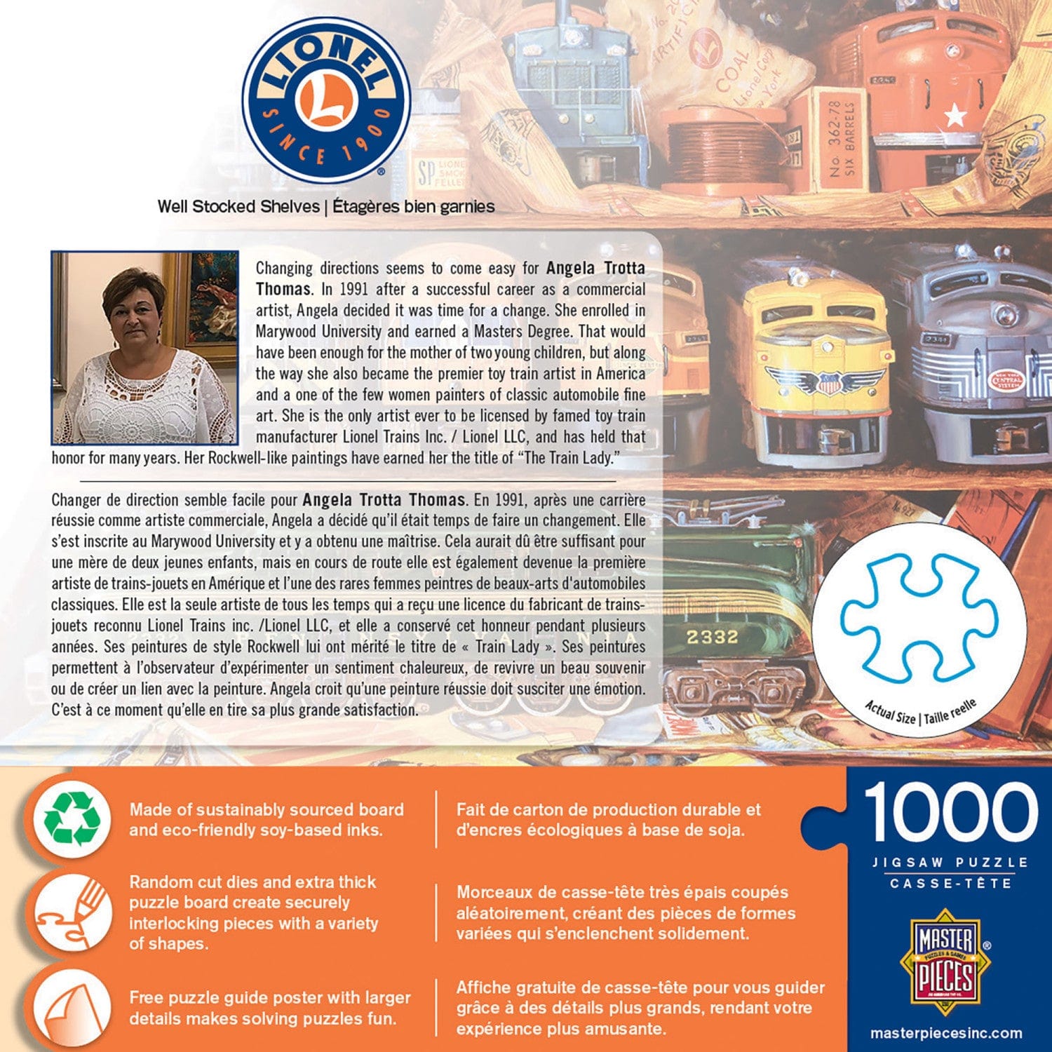 These MasterPieces Lionel Trains 19.25" x 26.75" 1000pc Puzzles are sure to become family favorites. Most collectible then ever before the Classic Lionel trains bring back fond memories of family times. Train collectors are sure to love the incredible details and accurate renditions of these American classics. To reduce their impact on our environment, the chipboard used in these puzzles is made of 100% recycled material.