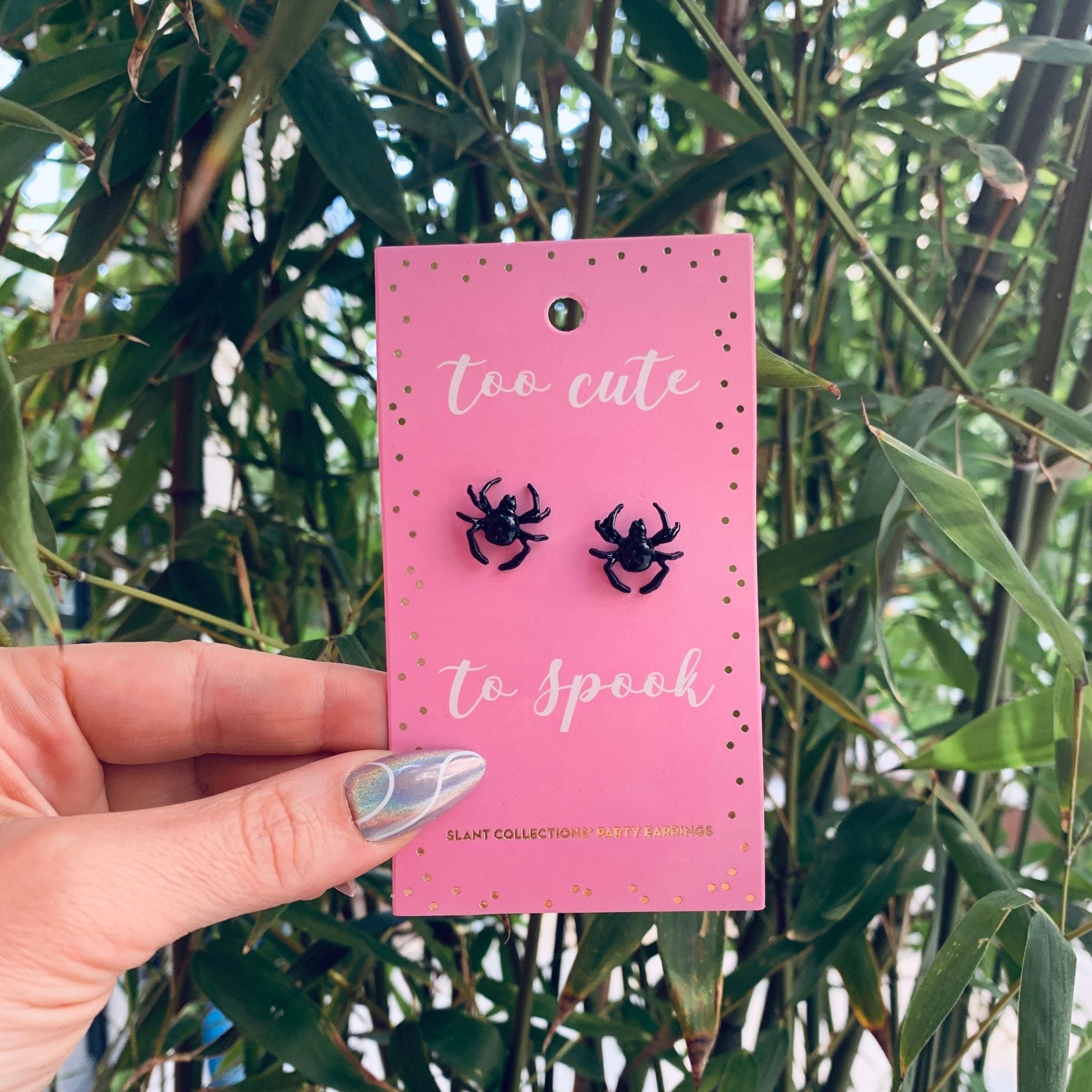 - SPIDER EARRINGS made of zinc alloy; frightfully fun backer card reads "Too Cute To Spook"