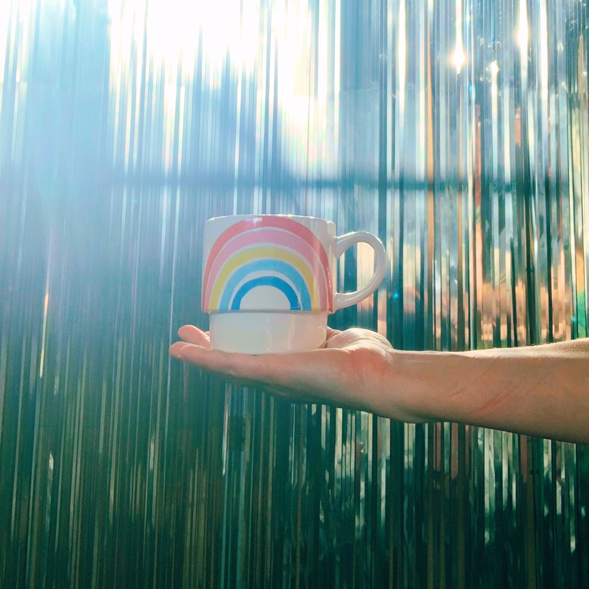 Convenient and stylish stackable coffee cups in off-white with a vintage style '70s-'80s painted rainbow design.