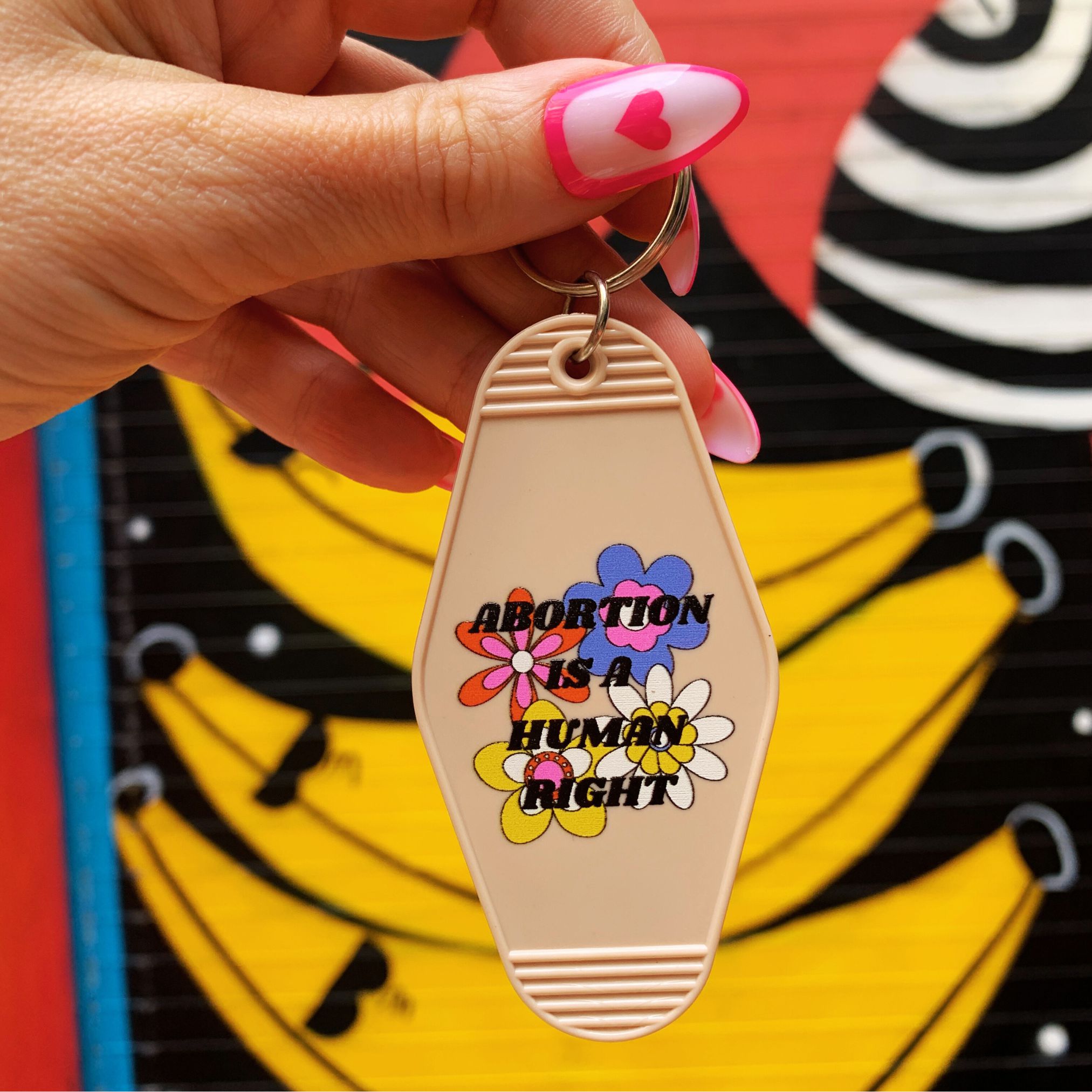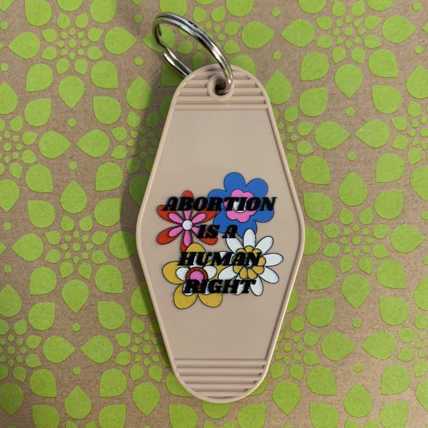Groovy flower keychain reads ABORTION IS A HUMAN RIGHT.