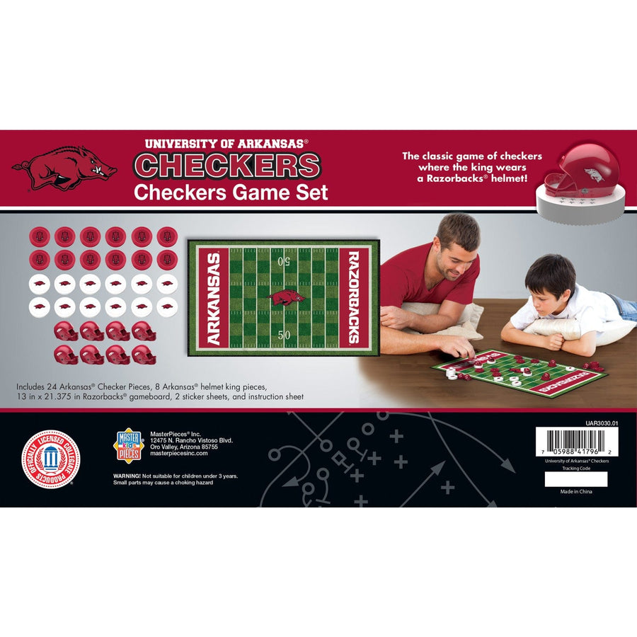 If you're a fan of the Arkansas Razorbacks, then you're going to love this officially licensed MasterPieces NCAA Arkansas Razorbacks Checkers Board Game. This classic game of checkers is a ton of fun for children and adults ages 6 and up, and it's a great way to show your Arkansas Razorbacks pride. This checkers game comes with 24 Arkansas Razorbacks checkers pieces, 8 helmet king pieces, a 13 inches x 21.375 inches game board, 1 sticker sheet, and an instruction sheet. So get ready to put your skills to the test and crown yourself the checkers champion!