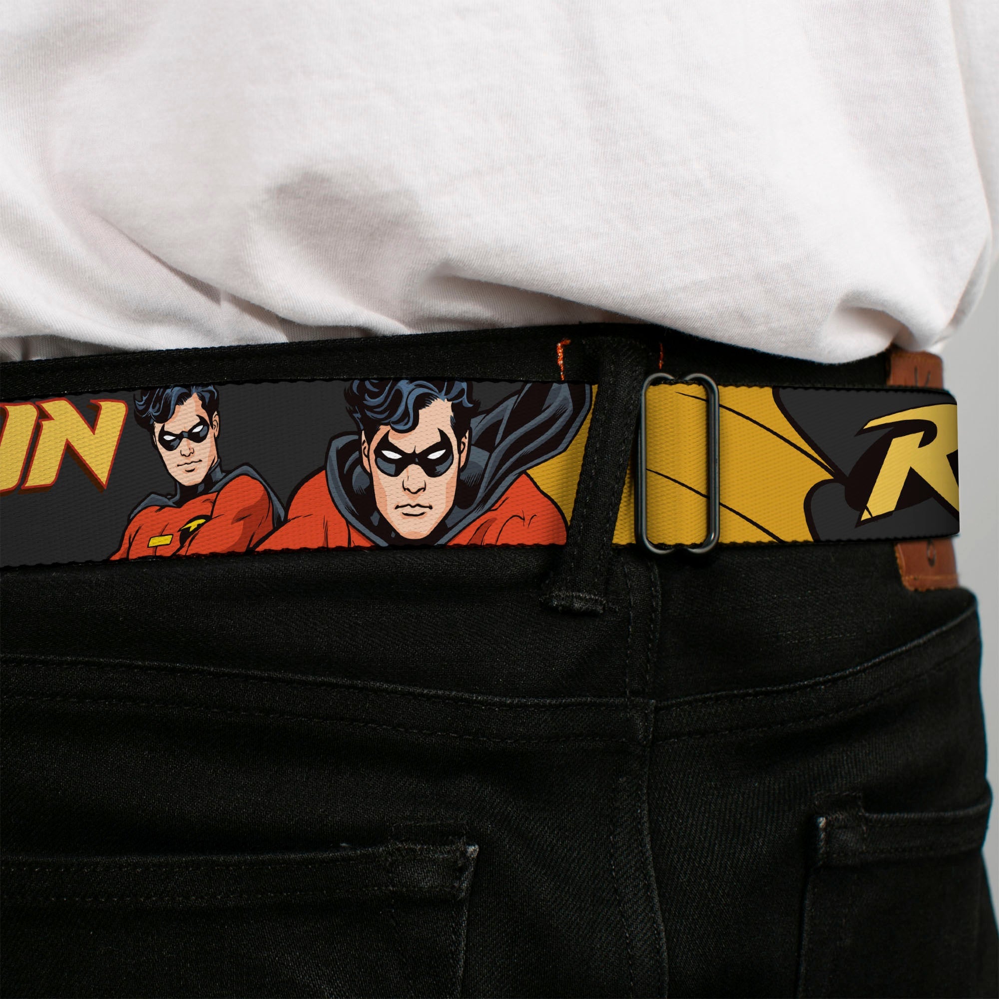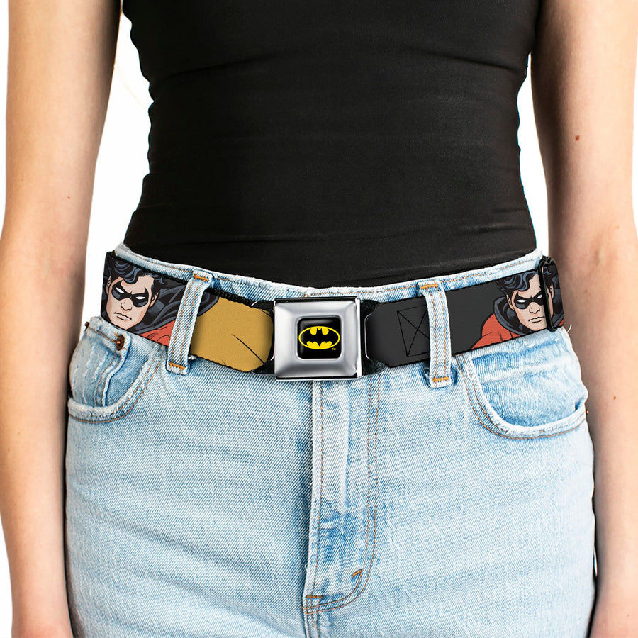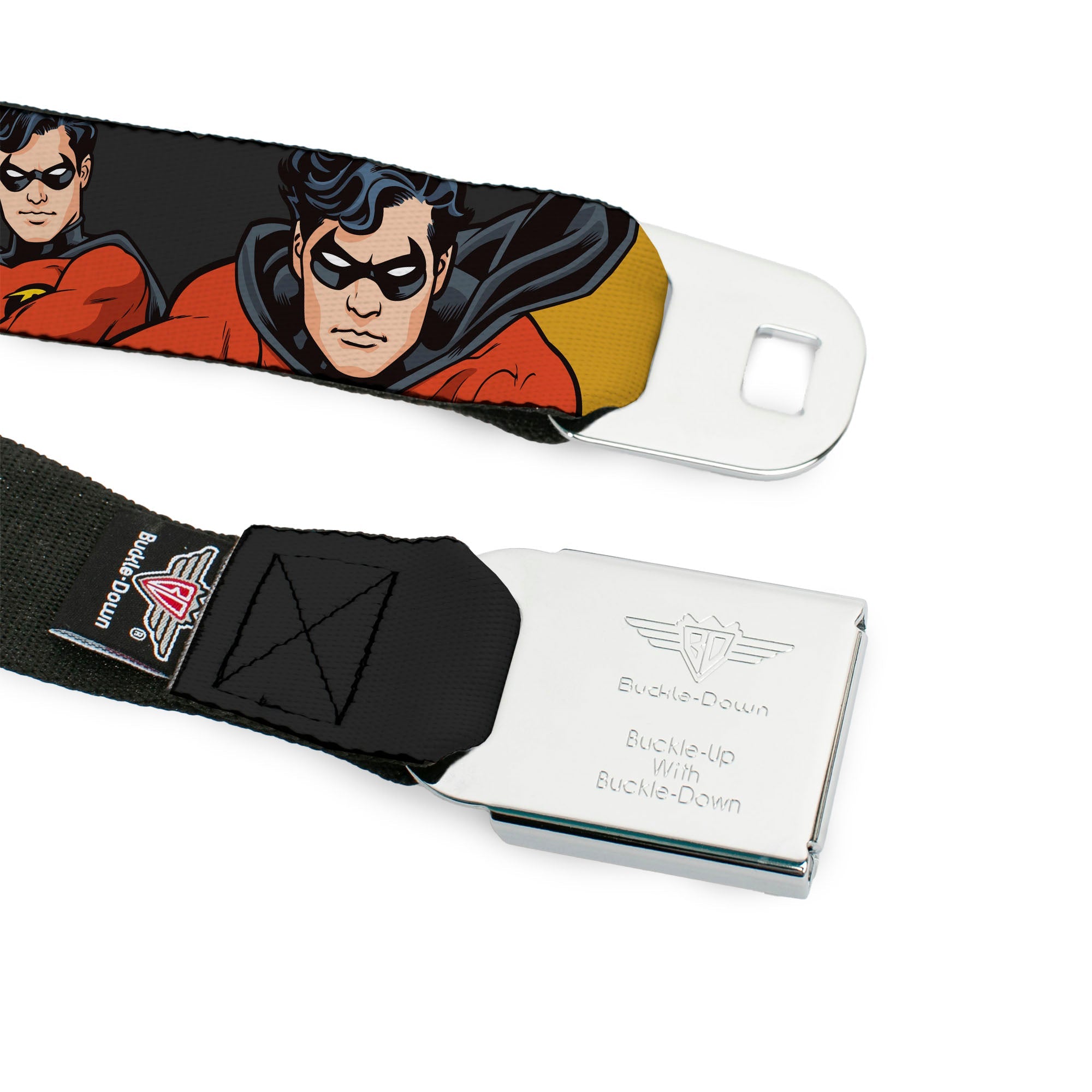 Batman Full Color Black Yellow Seatbelt Belt - ROBIN Red/Black Poses Gray Webbing