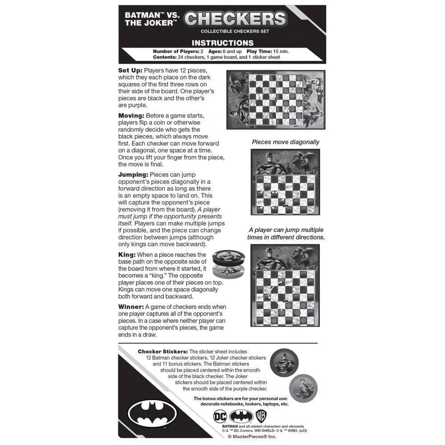 Experience the excitement of the Batman vs. Joker Checkers Board Game, a classic family board game designed for both kids and adults who love Batman toys and character checkers board games. This checkers board game features 12 black and 12 purple checker pieces, a large 13" x 21.375" Batman-themed game board, a sticker sheet with bonus stickers, and easy-to-follow instructions, making it perfect for board games for kids ages 6-8 and up. Enjoy fast-paced gameplay with an estimated playing time of 15 minutes, ideal for family game nights or gatherings with friends. The durable board and pieces are crafted for repeated play, and the vibrant Batman design makes it a standout among children's board games and batman kids collections. With no assembly required and no batteries needed, this checkers board game for kids and adults is ready to play right out of the box. Whether you’re searching for a big checkers board game, a unique addition to your batman game collection, or a fun alternative to a batman chess set, this game delivers hours of entertainment. Bring home the adventure and challenge your friends and family to see who will win the ultimate battle between Batman and The Joker.