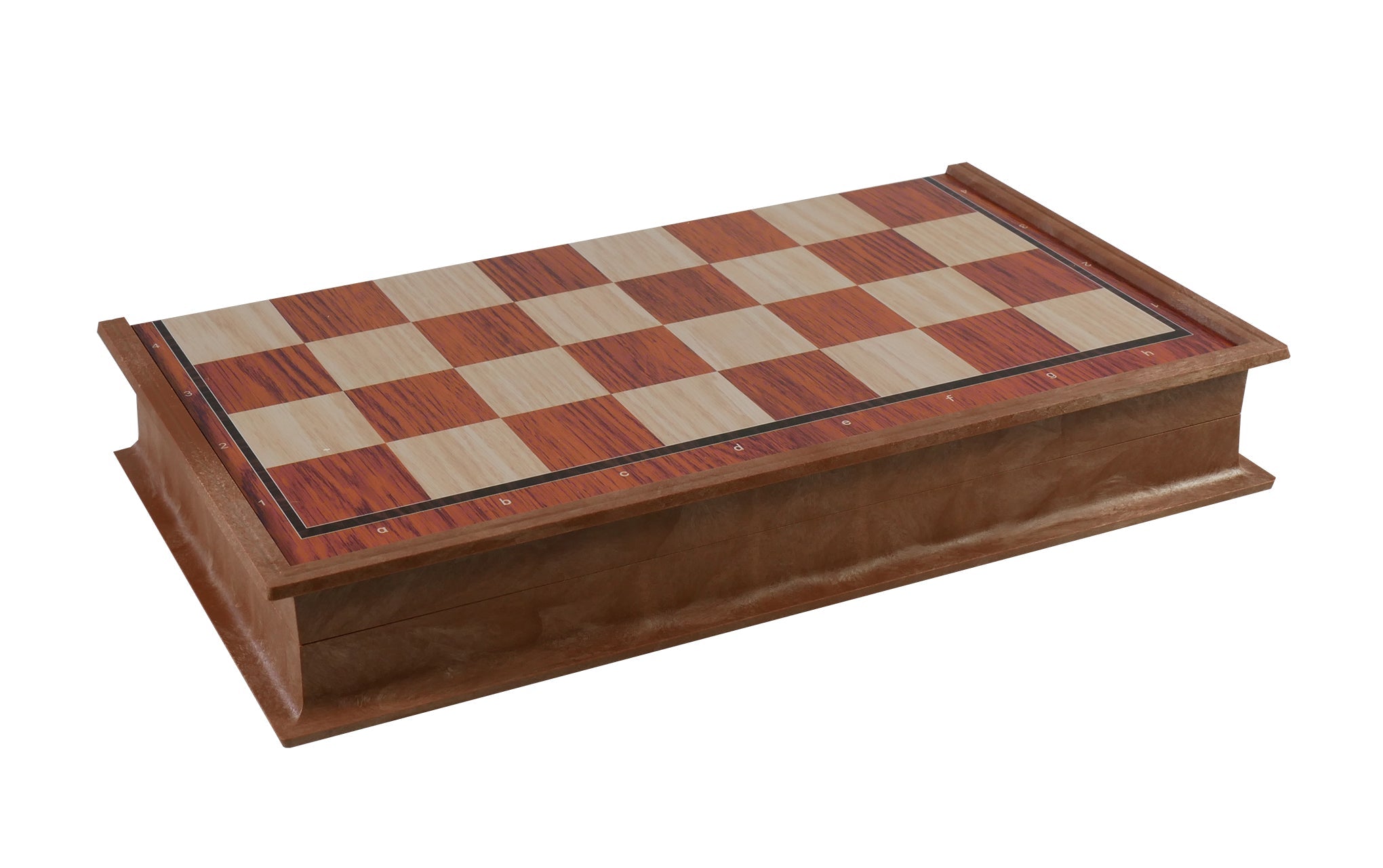 Plastic wood-tone tall chessmen on Metal wood-tone folding magnetic board 11"x6.25"x2" closed.