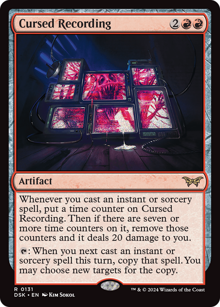 Whenever you cast an instant or sorcery spell, put a time counter on Cursed Recording. Then if there are seven or more time counters on it, remove those counters and it deals 20 damage to you.