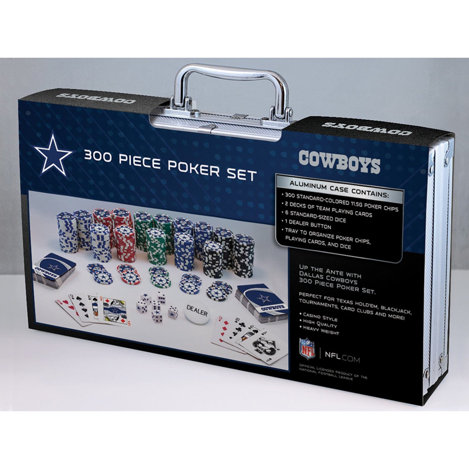 Show off your team pride at your next game night with this 300 piece poker set featuring Dallas Cowboys designs, perfect for fans seeking a professional poker chip set with case. Each heavy-weight 11.5-gram casino-style chip is crafted for an authentic feel and showcases custom Cowboys poker chips in official team colors. The set includes two decks of poker-size playing cards, each with unique Dallas Cowboy logos and team graphics on all face cards and jokers, plus six standard dice and a dealer chip for a complete cowboy poker set experience. The durable carrying case keeps your poker chip set organized and portable, making it ideal for travel or home tournaments. Designed for adults, this poker set 300 chips is made from high-quality plastic and measures 15.71 x 8.23 x 2.56 inches, weighing 9 pounds for a substantial, premium feel. Officially licensed by the NFL, this custom poker set is a standout gift for any Dallas Cowboy enthusiast or sports fan looking to elevate their poker nights.