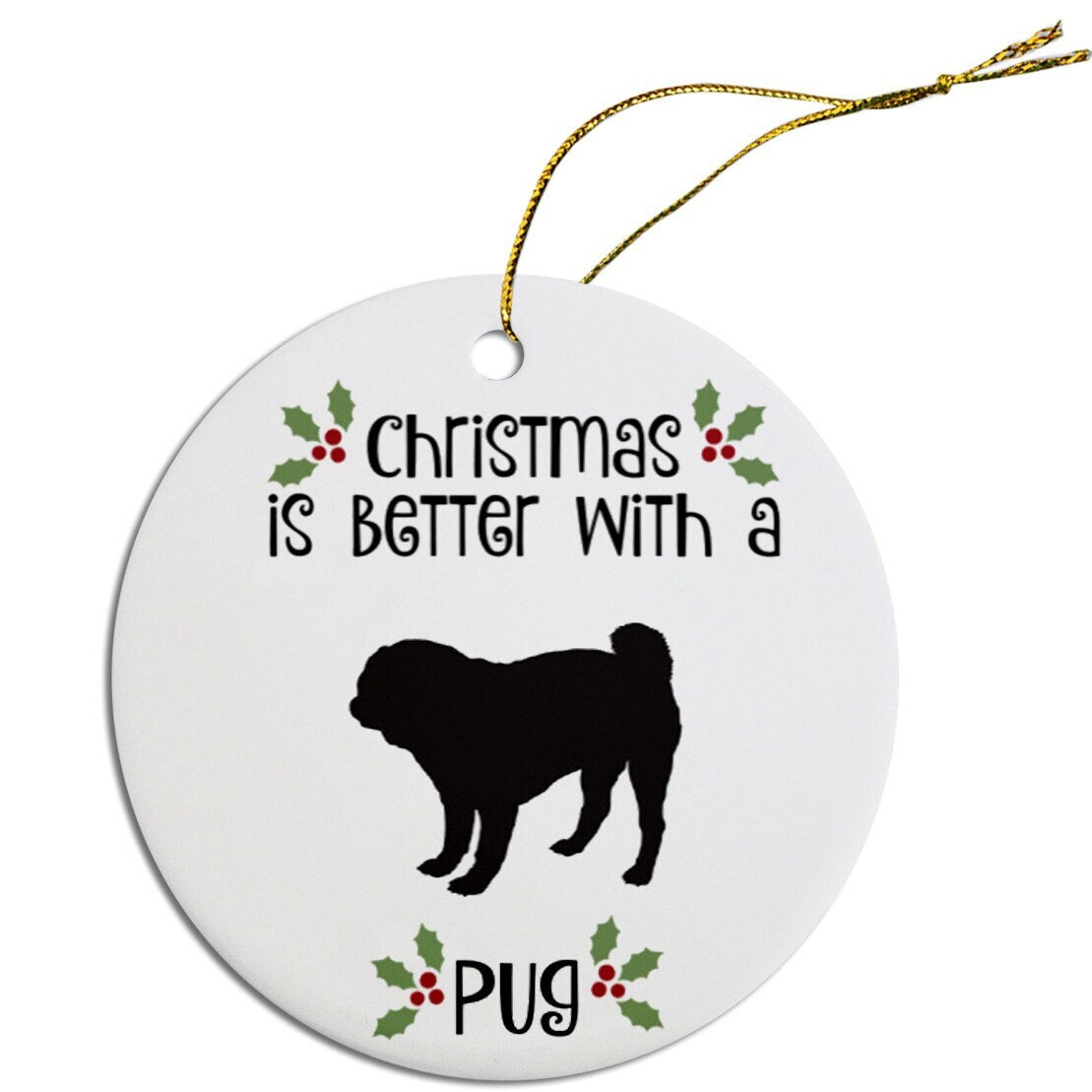 Dog Breed Specific Round Christmas Ornament, "Pug"