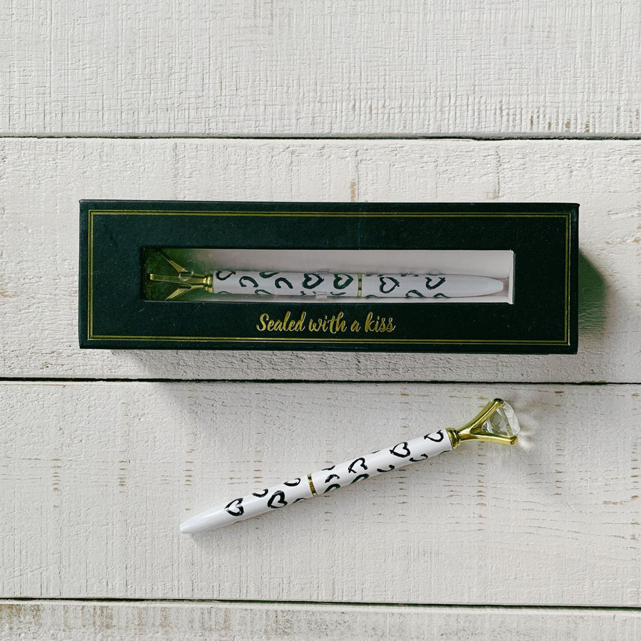 Add a touch of elegance to your workspace with the Heart Gem Pen in Gift Box, featuring a jewel-topped design and a black box with a gold border. Gift this unique pen to a loved one with the box reading "Sealed with a Kiss" for a special touch.