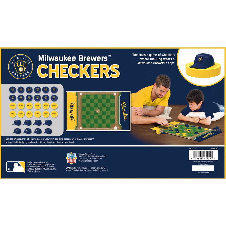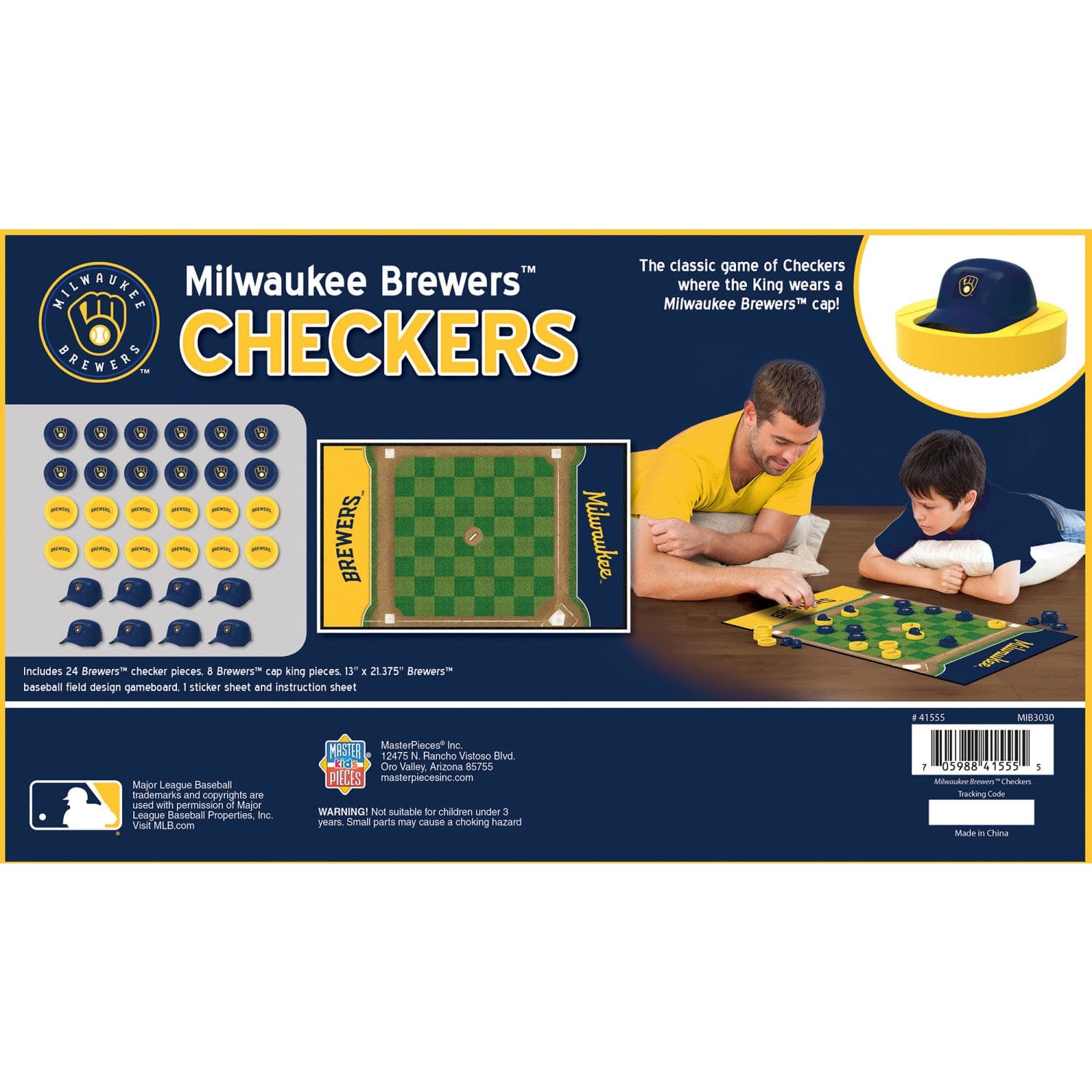 If you're a fan of the Milwaukee Brewers, then you're going to love this officially licensed MasterPieces MLB Milwaukee Brewers Checkers Board Game. This classic game of checkers is a ton of fun for children and adults ages 6 and up, and it's a great way to show your Milwaukee Brewers pride. This checkers game comes with 24 Milwaukee Brewers checkers pieces, 8 baseball helmet king pieces, a 13 inches x 21.375 inches game board, 1 sticker sheet, and an instruction sheet. So get ready to put your skills to the test and crown yourself the checkers champion!