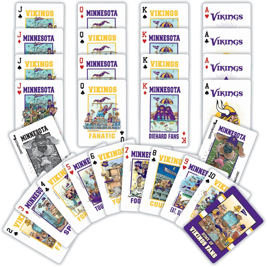 Show your team spirit with these officially licensed Minnesota Vikings playing cards, the ultimate addition to any NFL Vikings merchandise collection. This 54-card deck includes 52 standard poker-size cards and 2 jokers, each crafted from durable cardstock and featuring vibrant Minnesota Vikings team designs on all face cards and jokers. The card backs proudly display the iconic Vikings logo, making these Vikings cards a standout choice for game nights, tailgates, or as a Minnesota Vikings gift for fans. Sized at 3.5 x 2.5 inches, these classic playing cards are perfect for adults and collectors looking to enhance their Minnesota Vikings memorabilia or decor. Whether you’re hosting a game of poker, adding to your Vikings deck cards collection, or searching for unique Minnesota Vikings accessories, this deck is a must-have for any fan. Manufactured by Masterpieces, an American puzzle and game company, these cards are designed for quality and enjoyment, making them a great addition to your Minnesota playing cards or sports-themed board game collection.