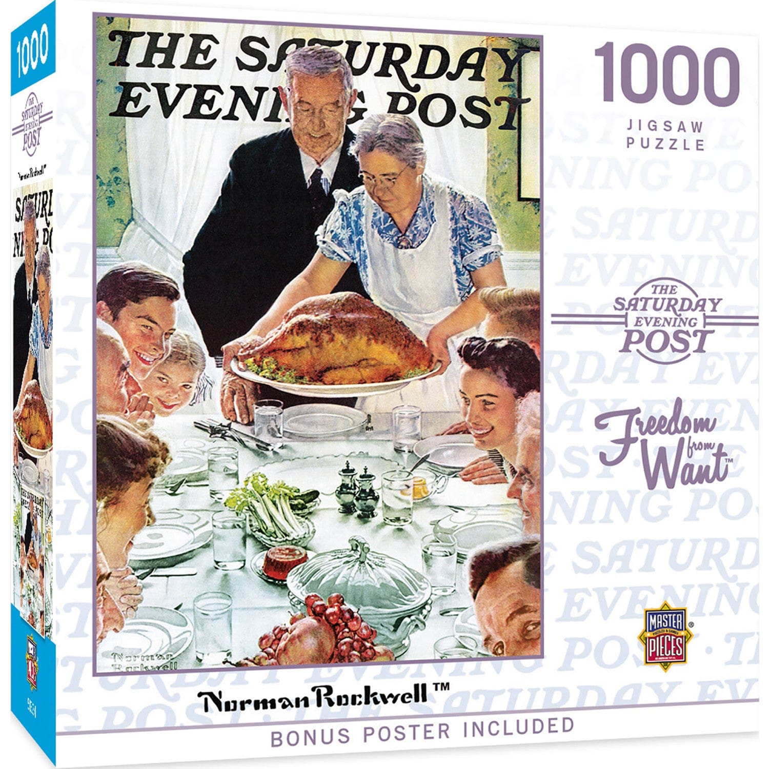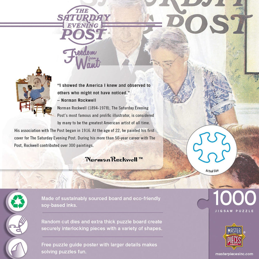 This MasterPieces Norman Rockwell - Saturday Evening Post 19.25" x 26.75" 1000pc Puzzle is sure to become a family favorite. Norman Rockwell began his career in 1916 with The Saturday Evening Post. His heartwarming and humorous illustrations of everyday American life appeared on the cover of the magazine for more than 50 years and contributed over 300 paintings. With this vintage scene of a family seated around the dinner table, smiling over a golden, roasted turkey, Norman Rockwell's Saturday Evening Post image is sure to have everyone reminiscing about the good old days. To reduce its impact on our environment, the chipboard used in this puzzle is made of 100% recycled material.
